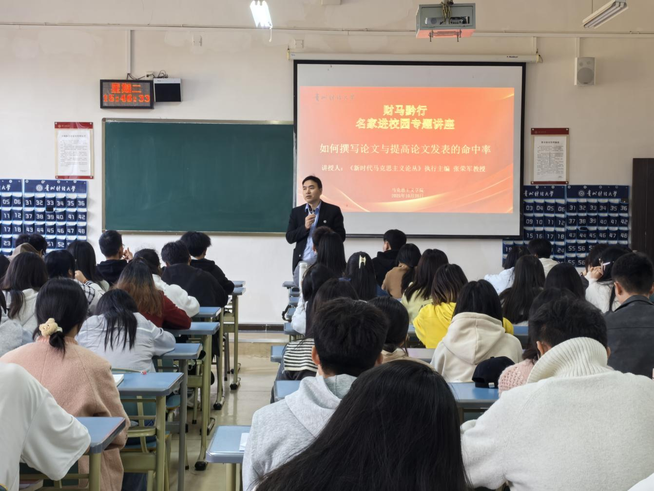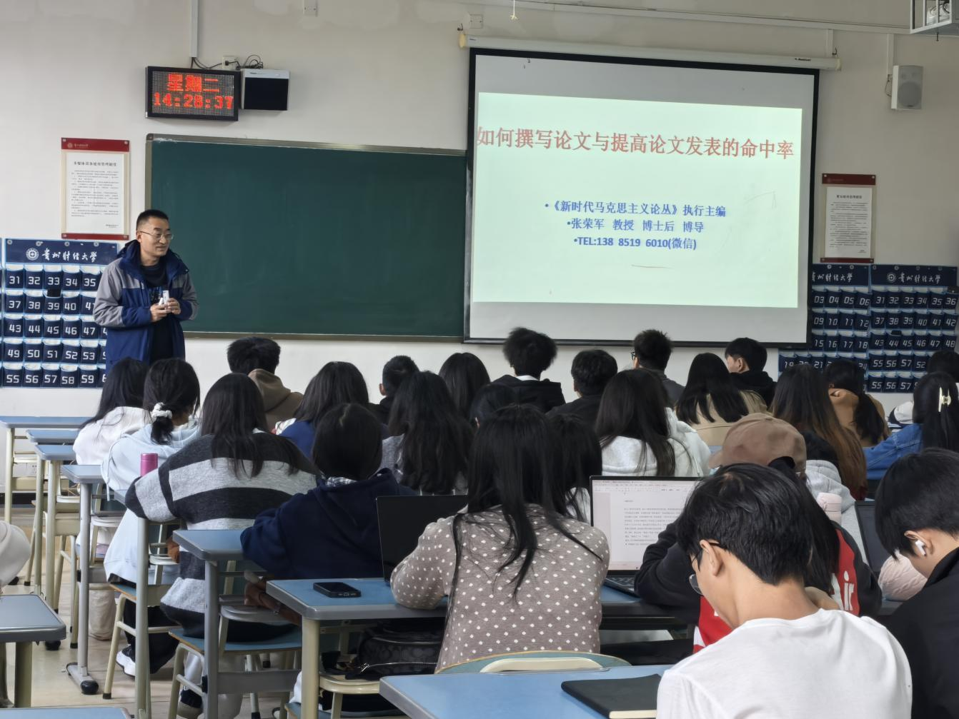 为加强高素质复合型创新人才的培养,切实提升马克思主义学院师生学术论文写作能力,2025年10月28日下午,贵州财经大学马克思主义学院邀请《新时代马克思主义论丛》执行主编张荣军教授在校博学楼2-17教室作题为《如何撰写论文与提高论文发表的命中率》的学术报告。报告由马克思主义理论系主任杨俊主持,马克思主义学院研究生、本科生和部分教师代表参加了此次讲座。