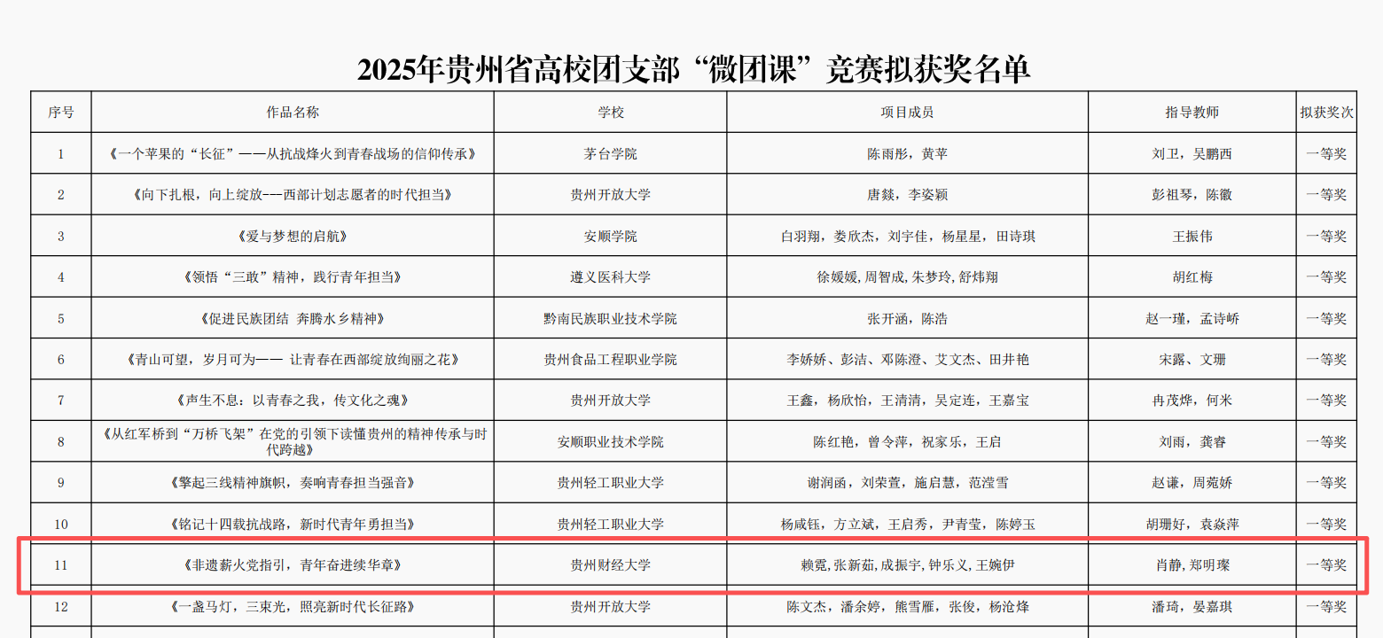 2025年11月21日,从贵州省高校团支部“微团课”竞赛现场传来捷报!我院2024级研究生团支部代表学校出战,与全省193支参赛队伍同台竞技,最终凭借其创新的展示形式、扎实的实践根基与深刻的理论融合,一举斩获大赛一等奖,实现了马克思主义学院在该赛事决赛路演中“零的突破”!
